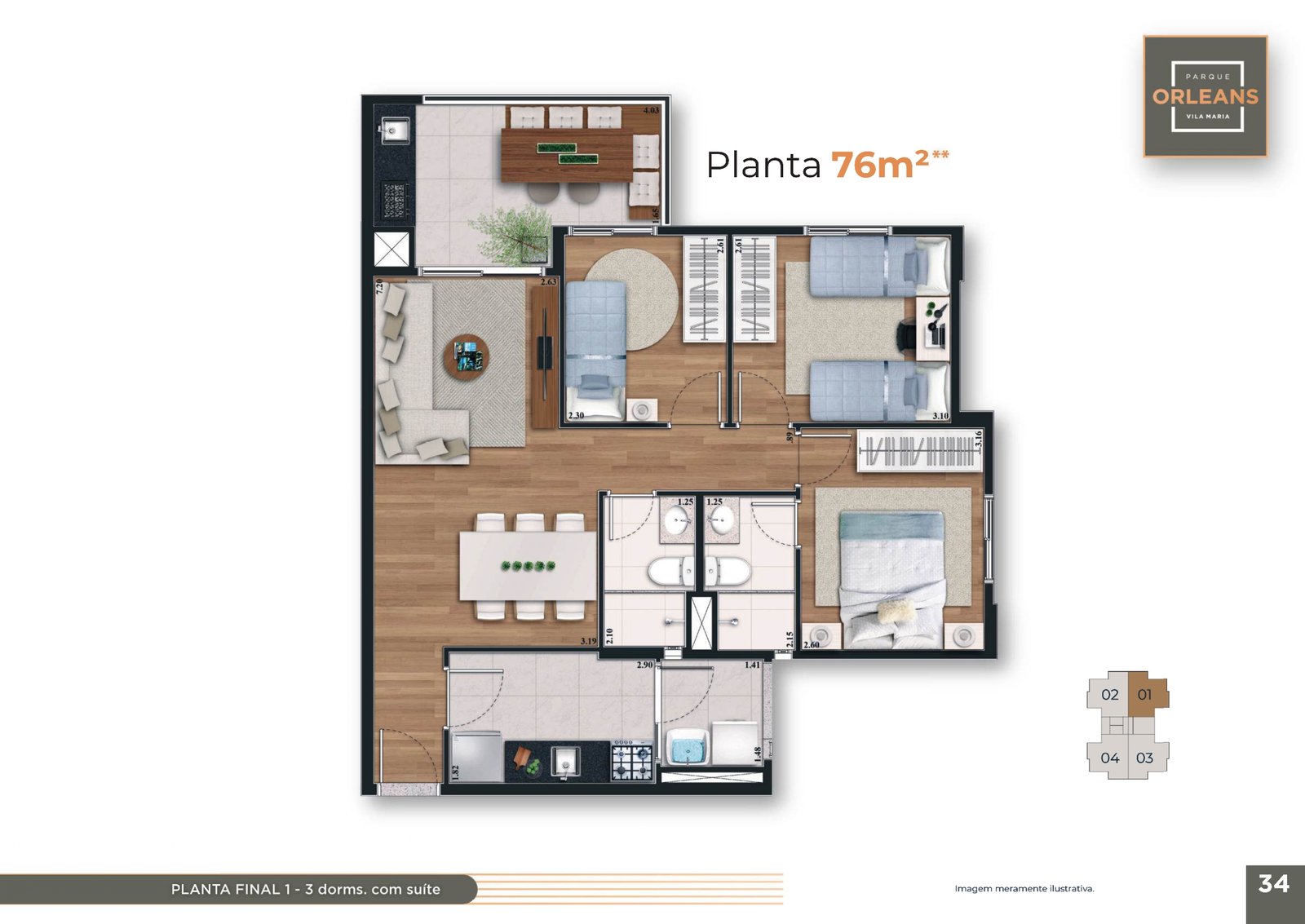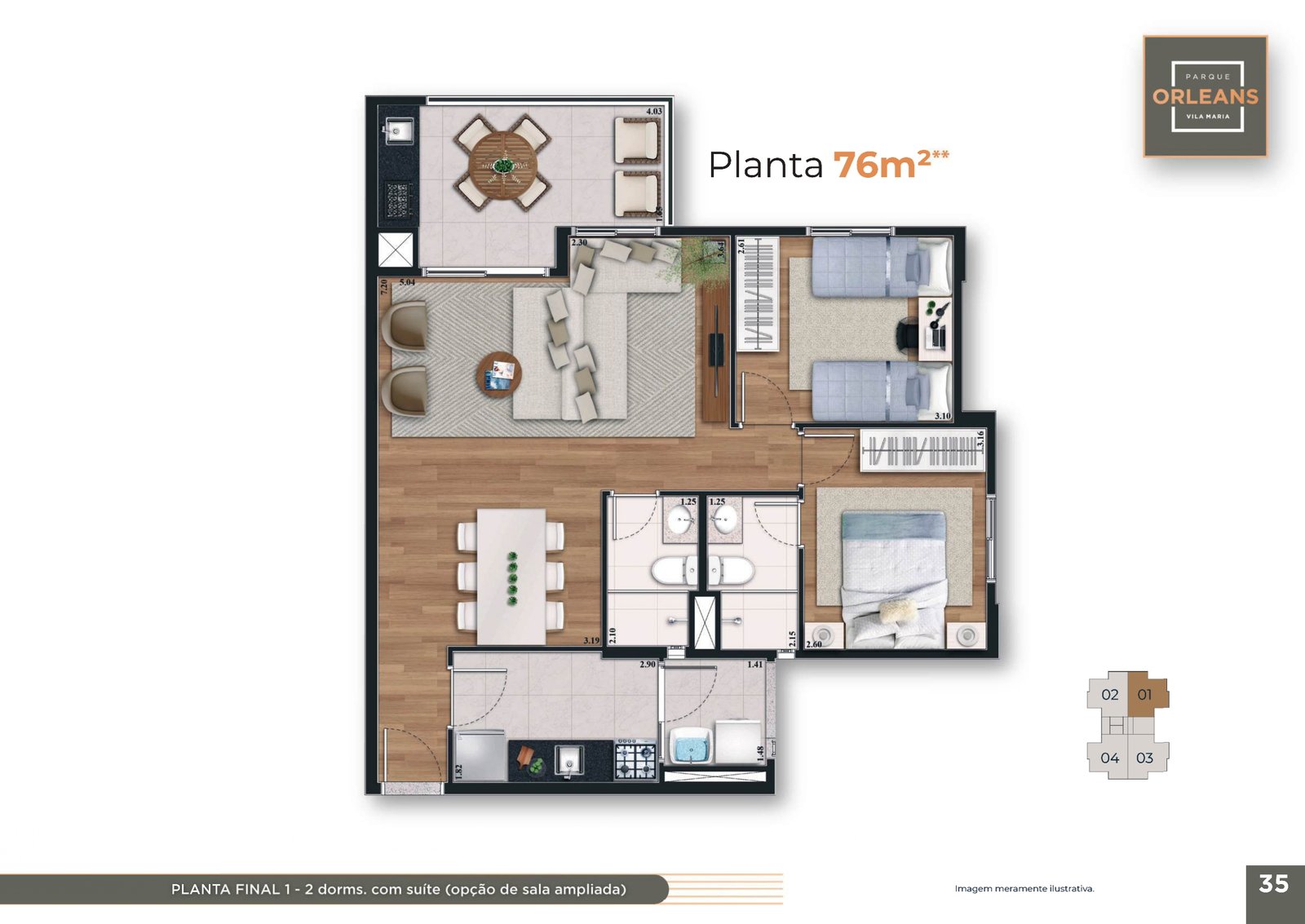 No Parque Orleans, cada metro quadrado foi planejado para oferecer o máximo de aproveitamento e conforto. Com uma planta de 76m² de área privativa (73m² do apartamento + 3m² de depósito exclusivo), você encontrará o equilíbrio perfeito entre áreas sociais integradas e a privacidade dos dormitórios.